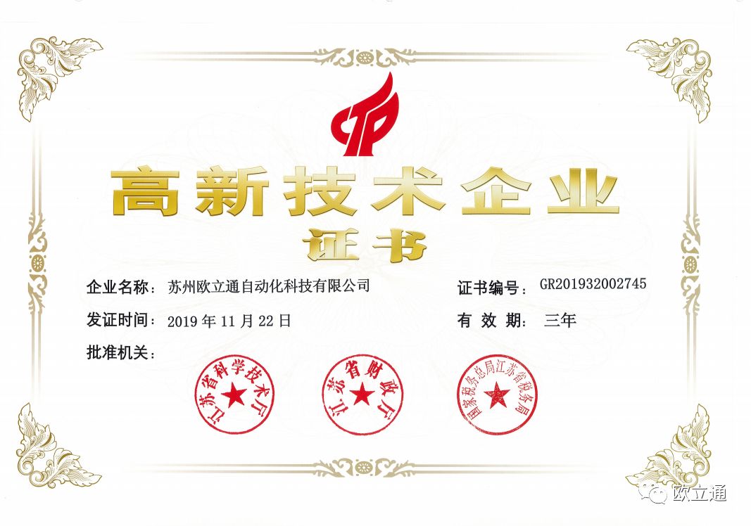 近日,苏州欧立通自动化科技有限公司通过江苏省2019年第二批高新技术企业认定,获得由江苏省科技厅、江苏省财政厅、国家税务总局江苏省税务局联合颁发的“高新技术企业”证书,正式跻身国家高新技术企业行列。